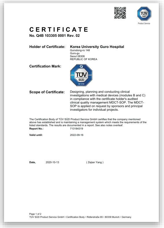 고려대학교병원 국제의료기기 임상시험 실시기관 인증서 (ISO 14155)